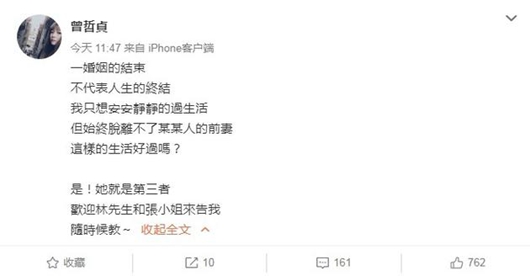 林瑞阳前妻直斥张庭小三,女星曾哲贞22年后揭离婚内幕。5月7日中午,林瑞阳前妻曾哲贞在社交平台再度发文,表示自己只想过安安静静的生活,不想因为林瑞阳前妻的身份再被打扰。她更是强调张庭就是第三者,欢迎林先生和张小姐来告。此前,有网友私讯开呛曾哲贞,曾哲贞忍无可忍晒出截图,罕见反击,并请对方守口德。